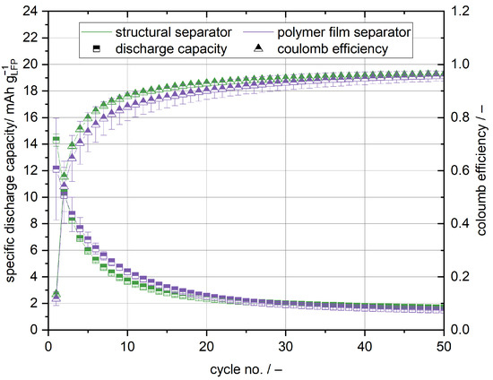 28]. It can be concluded that the structural separator does not withstand lithium dendrite growth as well as the polymer film separator, because the degradation happens much faster and is more pronounced. This is supported by a maximum coulomb efficiency of only 97% observed for the manually laminated cells, which is relatively poor for this type of system [