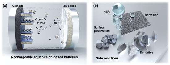 (a) Schematic illustration of working mechanism, and (b) side reactions of rechargeable Zn-based batteries in mild acid/neural electrolytes.