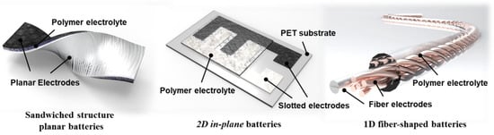 The configurations of flexible batteries can be classified into three categories, as shown in Figure 2. Substantial research effort has been focused on planar batteries with a sandwich architecture, in which the three layers of a Zn anode, polymer electrolyte and a cathode are linked tightly together layer-by-layer [23]. 2D flexible micro in-plane batteries, consisting of two slotted electrolytes printed onto a flexible polyethylene terephthalate (PET) substrate, are especially suitable as power accessories for flexible electronic systems fabricated by various printing technologies [43]. Fiber-shaped batteries possess a 1D configuration with small size, which can achieve extreme flexibility that enables tunable amounts of fiber batteries to be utilized as cotton yarns that can be woven/knitted into energy textiles for wearable applications [44,45]. However, the manufacturing process for 1D fiber-shaped batteries is much more difficult than that for assembly into a 2D configuration.