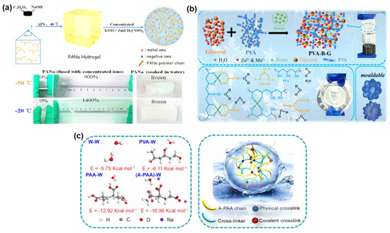(a) The molecular structure and stretchability of the anti-freezing concentrated PANa hydrogel electrolyte. Reproduced with permission from [47]. (b) Schematic fabrication of PVA−B−G hydrogel. Reproduced with permission from [48]. (c) Molecular models and simulated interactions between terminal groups and water molecules in different hydrogels. Reproduced with permission from [49].
