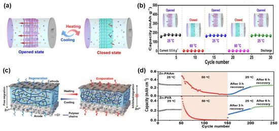 Apart from sol-gel transition, a new thermal self-protection strategy for improving the practicability and durability of Zn-MnO2 batteries through thermo-reversible property has been proposed [52]. In this research, the inner moisture of the synthesized PAM hydrogel electrolyte was controlled by adjusting the ZnCl2 concentration so that it could keep balance with the surrounding environment (25 °C and 70% relative humidity (RH)), enabling the hydrogel to maintain its whole mass even after 10 days (Figure 4c). However, upon heating to high temperatures, a large amount of moisture (~40 wt%) evaporated from the PAM hydrogel matrix, akin to sweating, thus dissipating the heat and automatically shutting down the over-heated battery. After cooling back to room temperature, the PAM hydrogel electrolyte was able to reabsorb moisture form the ambient environment and the battery performance was restored to its initial state. The whole process of dehydration and reabsorption of moisture as the temperature changed evidenced high reversibility, guaranteeing the long-run safety of Zn-MnO2 batteries (Figure 4d).