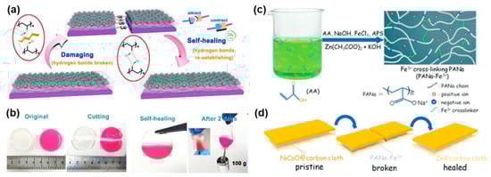In addition, Huang et al. exploited a self-healable hydrogel triggered by ferric ions crosslinking [53]. In this research, the Fe3+ ionic crosslinking formed among PANa chains bestowed the hydrogel electrolyte with an alkaline-tolerant capability and unique self-healing property (Figure 5c). The assembled flexible Zn/NiCo battery exhibited a high discharging capacity of 250 mAh g−1 with a high retention of 87% after four cutting-healing cycles (Figure 5d). Compared to the reversible physical bonding, the covalent bonding enabled higher self-healing efficiency due to its more stable bonding force [54]. However, self-healing effects based on covalent bonding are generally triggered by external stimuli, such as light, moisture or pH, hindering their application in batteries.