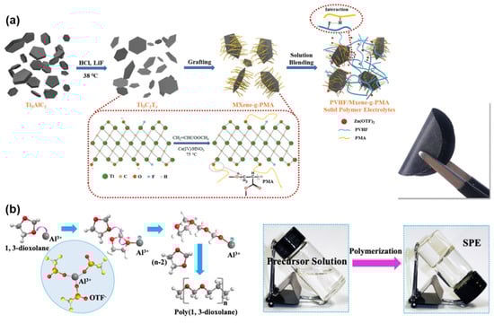 (a) Schematic fabrication of the solid state MXene-g-PMA electrolyte. Reproduced with permission from [59]. (b) The reaction mechanism of the 1,3-dioxolane based solid polymer electrolytes. Reproduced with permission from [60].