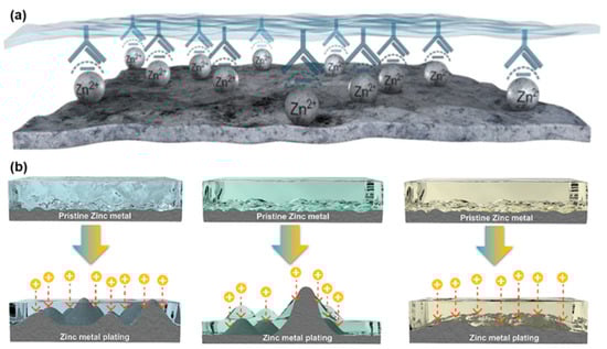For aqueous ZIBs, metallic Zn can be directly utilized as the anode due to its intrinsic stable chemical properties, possessing a high theoretical capacity of 5854 mAh cm−3 (or 820 mAh g−1) [13,14]. However, there are some challenges that occur in aqueous systems, which adversely affect the long-term stability of ZIBs. A key issue is that of zinc dendrites, which are normally caused by uneven Zn deposition. The irregular and rough morphology of the dendrites can easily lead to short-circuits [15,16]. Other key issues include side-reactions, which originate from the water splitting process of the aqueous electrolyte, including the hydrogen evolution reaction (HER) and corrosion. These unfavorable side-reactions result in the exhaustion of water and surface passivation of the Zn anode, leading to low battery efficiency [17,18]. Additionally, some cathode materials are slightly soluble in aqueous solution, resulting in gradual capacity deterioration. Fortunately, ion-conductive polymer electrolytes can effectively alleviate the above-mentioned issues. Due to the unique quasi-solid-state characteristics, the salt ions can be well dispersed and transmitted inside the gel matrix, offering the ion conductivity required for electrochemical reactions [19,20]. In addition, polymer electrolytes can serve as separators to avoid short-circuiting and can inhibit the dissolution of active materials relative to liquid electrolytes, while their intrinsic mechanical strength can, to some extent, suppress dendritic growth. Moreover, polymer electrolytes, which are soft and viscous, can form an intimate contact with the electrodes to decrease the interface impedance, and show a high level of compatibility with flexible ZIBs [21].