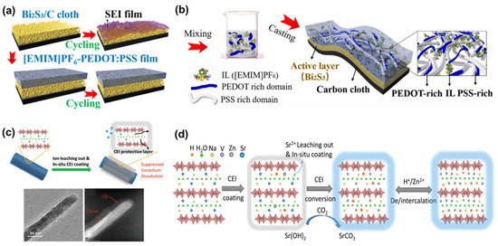 (a) Schematic illustration and (b) fabrication process of the [EMIM]PF6-PEDOT:PSS films. Reproduced with permission from [67]. (c) Schematic design principle and (d) working mechanism of the in situ CEI layer. Reproduced with permission from [68].
