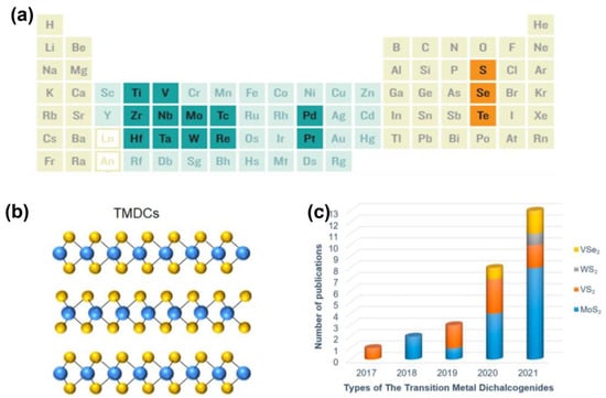 Structure of TMD materials. (a) Chemical elements composition of TMD materials. (b) Three−dimensional atomic structures of typical TMDs. Reprinted with permission from Ref. [19]. Copyright 2021, Springer. (c) The trend of publications on TMDs as ZIB cathode materials. Reprinted with permission from Ref. [10]. Copyright 2022, MDPI (Basel, Switzerland).