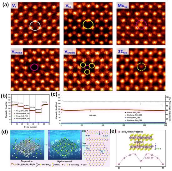 Vacancy is one of the most common structural defect of materials, such as sulfur vacancies, transition metal vacancies, edges, and holes in TMDs lattice, as shown in Figure 4a [34,36]. These vacancy defects are particularly attractive in two−dimensional monolayer TMDs because the transport of charge carriers in the two−dimensional plane is significantly enhanced. Moreover, the creation of vacancies exposes sites in the TMDs that can then be used for chemical functionalization [37,38]. It has been reported by Liu et al. that the formation energy of S vacancies in MoS2 (2.35 eV) is lower than that of Mo vacancies (8.02 eV) [39], indicating that it is easier to generate S vacancies than Mo vacancies, which is also verified by Koh et al. [40]. In particular, S vacancy is critical for the storage mechanism due to the ability to facilitate ion transit through the MoS2 layer [41]. Xu et al. investigated defect−engineered MoS2−x nanosheets as cathodes for zinc ion batteries [42]. Compared with defect−free MoS2, the defect−rich MoS2−x nanosheets provided more intercalation sites for zinc ions, resulting in higher capacity (Figure 4b). More importantly, it also exhibits remarkable cycling stability with a specific capacity retention of 87.8% after 1000 cycles at a current density of 1 A·g−1 (Figure 4c).