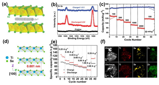 Recently, TiSe2 was verified to be an ideal candidate for aqueous ZIBs by Wen et al., as shown in Figure 5d [16]. The TiSe2 with 0.601 nm layer spacing and good electron conduction properties make it suitable for efficient (de)intercalation of zinc ions. As a result, the TiSe2 electrode showed a capacity of 128.0 mAh·g−1 at 0.20 A·g−1 (Figure 5e) and recoverability of 70.0% after 300 cycles. Especially, the high concentration distribution of zinc ions in the fully discharged state demonstrates the accomplished intercalation of zinc ions (Figure 5f).