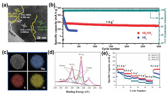To verify the effectiveness of in situ oxidation, Yu et al. constructed VS2/VOx composite structures with porous VOx nanosheets uniformly distributed on VS2 using electrochemical pretreatment [47]. In particular, the lattice fringes of 0.295 and 0.345 nm correspond to the (400) and (100) planes of V6O13 (Figure 6a). Benefiting from the synergy of the high conductivity of VS2 and the remarkable stability of VOx, the VS2/VOx heterostructure facilitates the regulation of guest ion intercalation and improves the chemical stability of the VS2 backbone. The buffer volume was changed by the gradual insertion of Zn2+ while accelerating the reversible reaction kinetics. The VS2/VOx electrode maintained a high capacity of 75% after 3000 cycles at 1 A∙g−1. (Figure 6b). In addition, MoS2−O was prepared as a cathode for ZIBs by a simple solvothermal method by Jia et al. [17]. EDS and XPS characterization verifies the existence of O insertion in MoS2 (Figure 6c,d). MoS2−O reduced the ion diffusion resistance and maintained the stability of the MoS2 layer. The optimized MoS2−O electrode exhibited a high specific capacity of 206.7 mAh·g−1 at a current density of 0.1 A·g−1 (Figure 6e) and remarkable cycling stability after 300 cycles, further confirming the effectiveness of the oxidation strategy.
