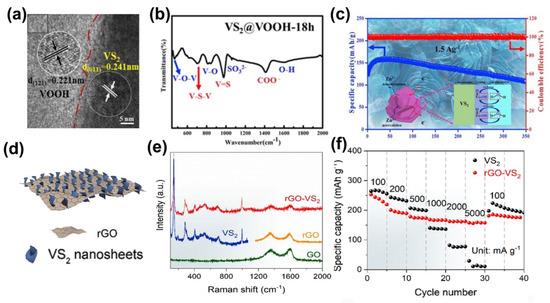 The hybridization strategy is particularly applicable between TMD materials because the host and guest TMDs usually have similar structures and the lattice mismatch can be neglected. Generally, the host and guest TMDs can be hybridized by epitaxial growth, and the composites are often able to exhibit stronger intrinsic properties, multifunctionality, or even new properties. For example, a MoS2−MoSe2 heterostructure assembled by liquid−phase ultrasound−assisted exfoliation was reported by Yang et al. [50]. Benefiting from the unique van der Waals interlayer coupling, the MoS2−MoSe2 heterostructure is able to provide more electrochemical active sites. Moreover, the fluffy construction of the MoS2−MoSe2 heterostructure enhances ion transport. Pu et al. fabricated VS2@VOOH via hydrothermal synthesis (Figure 7a) [51]. The presence of V−O−V and O−H vibrational was demonstrated by FT−IR spectroscopic characterization at typical 480 and 1610 cm−1 adsorption peaks, respectively (Figure 7b), which further solidifies the existence of VOOH in VS2. The O−H in VOOH not only improved the wettability of the electrode and electrolyte, but also reduced vanadium dissolution and improved the electrochemical performance. This composite displayed a remarkable capacity of 107.5 mAh·g−1 after 350 cycles at 1.5 A·g−1. In particular, after 400 cycles at a high current density of 2.5 A·g−1, it maintains a capacity of 91.4 mAh·g−1 (Figure 7c). In the hybridization of cathode materials for energy storage systems, both carbon nanotubes and graphene are widely used for their remarkable electrical and mechanical properties [52,53], and by hybridizing TMDs and CNT/graphene, the conductivity of the whole composite can be effectively improved while maintaining a large layer spacing colleague. A novel two−dimensional layered composite composed of graphene sheets were grown vertically on metallic 1T−VS2 nanosheets by a one−step solvothermal strategy by Chen et al. [54], as shown in Figure 7d. The rGO−VS2 was confirmed by Raman spectroscopy (Figure 7e). Due to the advantageous synergy between the layered VS2 and graphene nanosheets, the rGO−VS2 composites demonstrated a high capacity of 238 mAh·g−1 at 0.1 A·g−1 and capacity retention of more than 93% after 1000 cycles at 5 A·g−1 as ZIB cathodes (Figure 7f).