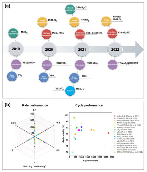 Summary of modified TMDs for high−performance ZIBs. (a) Timeline of developed strategies for TMD−based ZIB cathode. (b) The radar chart of the electrochemical performance of TMD materials as ZIB cathode. Refs. [12,14,16,17,18,22,23,28,29,42,43,44,47,51,54,55].