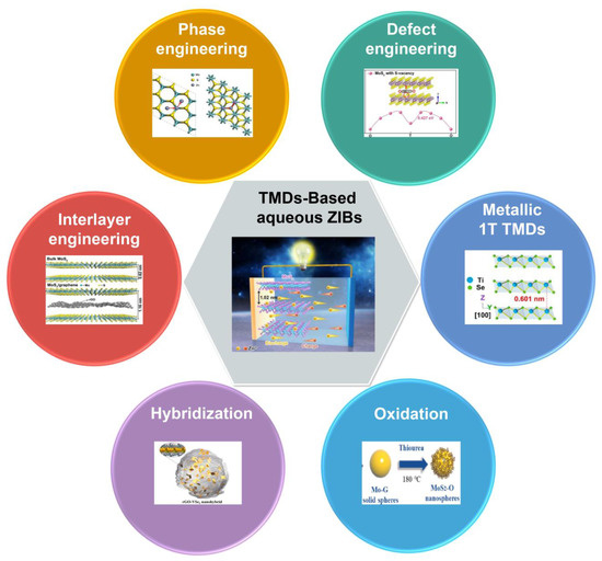 Transition metal dichalcogenides (TMDs), such as MoS2, WSe2, and VS2, have been considered as another promising cathode material in energy storage systems, benefitting from unique electrical properties and competitive layer spacing [10]. Compared with the above−mentioned cathode materials, TMDs process the unique hexagonal crystal structure and chemical stability, which may make TMDs exhibit better cycling performance. In particular, the appealing property of TMDs, the wide interlayer distance, is feasible for ion diffusion and intercalation, which is ideal for high−capacity aqueous ZIBs [11]. However, the inserted Zn2+−induced electrostatic interactions and the poor electrical conductivity hinder the capacity of bulk TMDs. As a result, bulk MoS2 and WS2 exhibit unsatisfactory capacity of 18 and 22 mAh·g−1 as the aqueous ZIB cathode materials, respectively [12]. Hence, efficient strategies for improving the Zn2+ storage ability of TMD cathodes are highly desired. In this review, recent advanced approaches to optimize the Zn2+ storage ability of TMDs, including interlayer engineering, phase engineering, defect engineering, metallic 1T TMDs, oxidation, and hybridization, have been comprehensively summarized (Scheme 1), which would provide clear guidance to design high−performance TMD−based aqueous ZIBs.