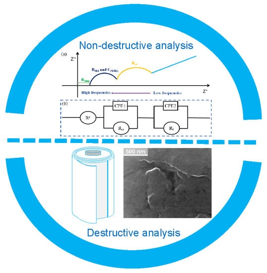 With the rapid development of green energy solutions, such as electric vehicles (EVs) and renewable power generation, lithium-ion batteries (LIBs) attract a lot of interest these days. Lithium chemistry offers high electrode potential (−3.04 vs. standard hydrogen electrode), low molecular weight and small ionic and atomic radii, ensuring fast diffusion and possibility of intercalation or integration into crystalline lattice of various materials. This helped Li-based batteries to outperform other secondary batteries both in terms of highest power and energy density as well as substantial lifetime []. However, uncertainties related to cost, degradation and weak performance in extreme weather conditions slow down large-scale adoption of Li-batteries. In particular, to meet the requirements in electrical vehicle (EV) applications, Li-ion batteries need to exhibit large capacity, stable thermal properties and a long lifetime [,,,,,]. Thus, detailed understanding of Li-ion batteries degradation behavior and mechanisms becomes a focal point of current battery research.