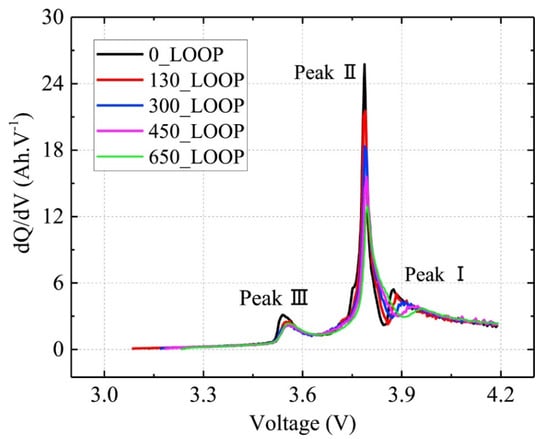 According to many studies, ICA has been employed to diagnose the battery aging mechanisms [,,,,,,]. The incremental capacity (IC) curve is calculated by derivation of the voltage curve, which can reflect the electrochemical process in the charging procedure [,,,,]. The analysis of the mechanism of battery aging is carried out by the position and shape of the peaks. For example, Yang et al. used IC curves to present the aging mechanisms, which is shown in Figure 2 []. Figure 2 shows the change of the IC curve during aging process, resulting from the 0.05 C-rates charging step. Three peaks decrease in the process of aging, which reflects the loss of the active materials (LAM) and loss of lithium inventory (LLI) on the electrode.