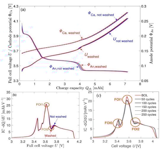 (a) Open circuit potentials before coin cells begin aging; (b) IC of the full cell voltage; (c) defined features of interest (FOIs) of the incremental capacity (IC) curves [,]. Reprint with permission []; Copyright 2019, Elsevier. Reprint with permission []; Copyright 2020, MDPI.