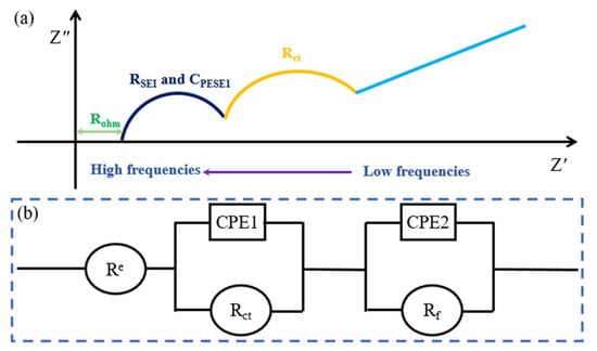 The EIS result is usually described by Nyquist plot, which involves the imaginary part (y axis) and the real part (x axis) of the impedance of the cells. The internal impedance of a cell is usually defined as a turning point at the low frequency area of EIS in a battery management system [,,]. Fitting the Nyquist plot to the LIB equivalent circuit model allows for the modelling of battery dynamics [,,,]. Rohm stands for the voltage drops because of the conductivity dropping during aging, such as current collector, binder, electrode and electrolyte electronic particles. Rf stands for Rflim, which refers to passivating film resistance. The process of charge transfer and conduction through the passivation layer should be considered as two sub-circuits consisting of pure resistors and pure capacitor elements in parallel. Considering the complexity of the electrode-solution interface, EIS was deconvoluted to the equivalent circuit shown in Figure 4, where the pure capacitance element was replaced by the constant phase element.