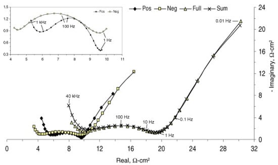 Impedance data measured at 3.72 V, which is the full voltage. The illustration inserted is an extended view of the respective electrode data []. Reprint with permission []; Copyright 2004, Elsevier.