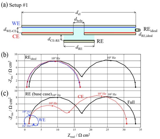 (a) Setup #1 with a hole in the CE of a three-electrode coin cell setup. Spectra are measured vs. (b) REideal and (c) RE. []. Reprint with permission []; Copyright 2014, IOP Science.