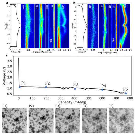 The voltage profiles and the corresponding contour plots showing XRD peak evolution for (a) pristine and (b) PEDOT-coated LiCoO2 electrode during one cycle at C/2 with a cutoff voltage at 4.5 V. (c) Discharge curve during the over-lithiation test. Five points (P1–P5) were selected to show the respective TXM images [,]. Reprint with permission []; Copyright 2021, American Chemical Society. Reprint with permission []; Copyright 2021, Elsevier.