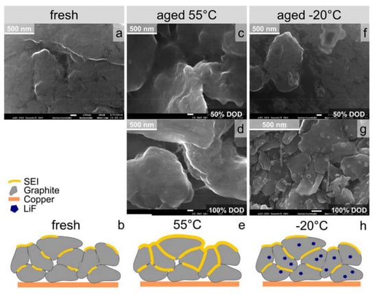 SEM images of the anodes which opened from aged cells via different aging profiles: (a) fresh cell; (c) 50% depth of discharge (DOD); (d) 100% DOD using AP2 at 55 °C; (f) 50% DOD; (g) 100% DOD using AP2 at −20 °C; (b,e,h) show the fresh anode and the anode from cells aged at 55 °C and −20 °C, respectively [].