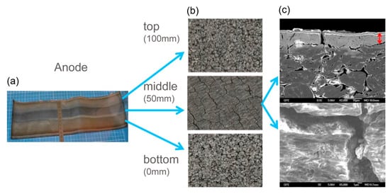 Optical microscope images of the aged cells: (a) photo of the anode; (b) laser microscope images; (c) SEM images []. Reprint with permission []; Copyright 2017, Elsevier.