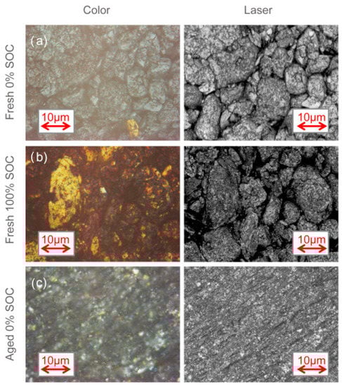 Laser microscope images of (a) a fresh cell at 0% SOC; (b) a fresh cell at 100% SOC; (c) an aged cell at 1C and 10% DOD, which can be observed covering a thick layer []. Reprint with permission []; Copyright 2017, Elsevier.