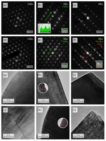 Diffraction pattern from changing materials of BOL cathodes: (a) LMO; (b) LiNi0.5 Co0.2Mn0.3O2 (NCM); (c) LiNi0.8Co0.15Al0.05O2 (NCA). Diffraction patterns from cathode which were aging using high rates at 40 °C (HR40): (d) LMO; (e) NCM; (f) NCA. HRTEM images: (g) LMO; (h) NCM; (i) NCA and under HR40 condition: (j) LMO; (k) NCM; (l) NCA []. Reprint with permission []; Copyright 2016, Elsevier.