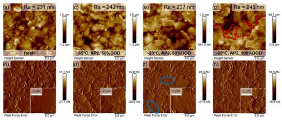 The height images are on the top and PEF images on the bottom: (a,b) fresh anode; (c,d) cell aged at 55 °C using AP2, 50% DOD; (e,f) cell aged at −20 °C using AP2, 50% DOD; (g,h) cell aged at −20 °C using AP2, 100% DOD. The blue circles emphasize the flat graphite, and the red arrows are using to present Li plating [].