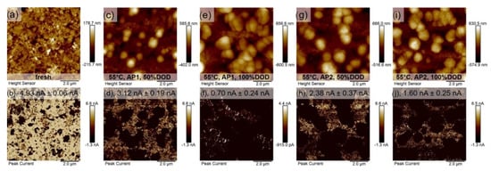 Topography (a–i) and the average current magnitude (b–j) of the cathodes [].