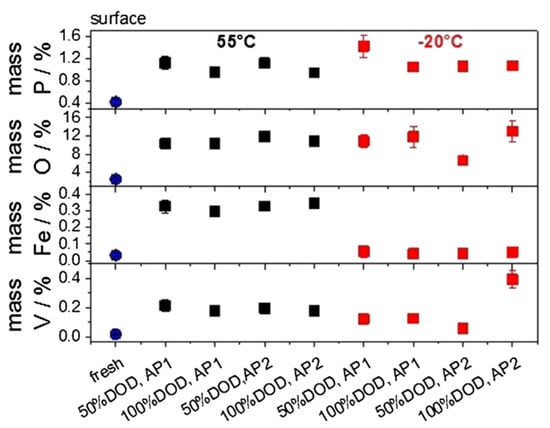 Since elements from the cathode will dissolve in electrolyte and also transfer to anode surface, EDX measurements is usually used to measure anode. As mentioned in Section 3.1, Simolka et al. found that in the same aging profile, the anode surface under 50% DOD shows higher Phosphorous content than that under 100% DOD, which is shown in Figure 14 []. The well-known explanation is that higher SOC cycles lead to more significant SEI generation [,,] than lower SOC cycles. At a 50% DOD cycle, the battery has a higher SOC range (compared to 100% DOD), a longer duration, and more electrolyte decompositions. In addition, the number of cycling cycles is quite different between changing DOD. The more latent cycles under 50% DOD, the thicker SEI and the more Li consumed during aging. The P and O on the surface of the aging anode at −20 °C increase to a similar extent even if the SEI is not obvious in observations of SEM and AFM. This is because the coated Li has reaction with the electrolyte to form a breakdown product on an anode aged at −20 °C, even if the graphite surface flake is not completely covered at 55 °C.