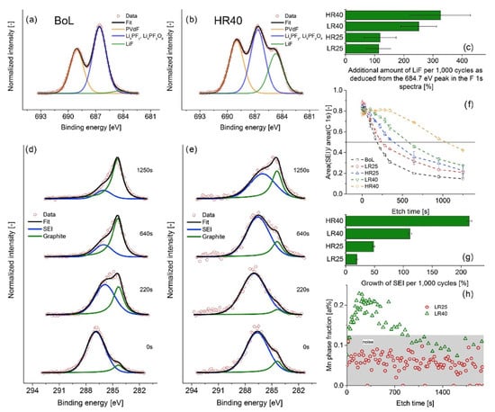 The spectra of F 1s from: (a) BoL; (b) HR40; (c) comparison in all anodes. The spectra of C 1s with argon sputter under variety times: (d) BoL; (e) HR40 anodes; (f) figure of SEI mass content related to argon etch time; (g) SEI thicknesses compared to BoL; (h) Manganese elements distribution depth in the LR25 and LR40 samples []. Reprint with permission []; Copyright 2016, Elsevier.
