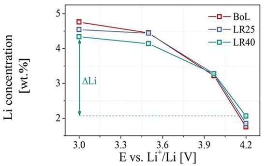 In the work of Mariyam et al., they used ICP-OES to measure the composition of cells at BOL, aged using low rates at 25 °C (LR25), and high rates at 40 °C (HR40), respectively []. They used ICP-OES to quantify the capacity loss of the cathode to measure lithium element concentration by ICP-OES. In Figure 16, the relationship between the weight percentage of lithium in these cathodes and the voltage is represented. It is clear from the diagram that the amount of active lithium in the fatigue cathode decreases comparing to the lithium in the cathode of BOL condition. In the constant voltage step, large amounts of lithium insertion still occur on the fatigued cathode/extracted from the cathode.