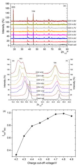 XRD patterns of LiCoO2 before and after overcharge: (a) full pattern, (b) in the (003); (c) (104) peak area; (d) COV dependence of peak strength ration of I104/003 []. Reprint with permission []; Copyright 2013, Elsevier.