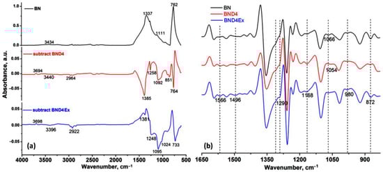 ATR-IR spectrum of BN, subtracted spectra of BND4 and BND4 Ex, (a) and the 2nd derivative of the spectra of the sample in the 1650–830 cm−1 (b).