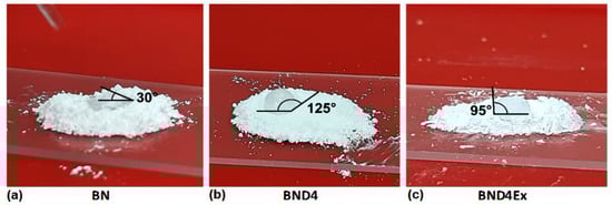 Photo images showing the shape of the water drop on the pristine BN powder (a) or treated differently: with D4 (b) and exfoliated after hydrophobization with D4 (c).