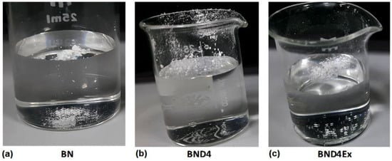 Images revealing the behavior, on contact, with water of the pristine BN powder (a) or treated differently: with D4 (b) and exfoliated after hydrophobization with D4 (c).