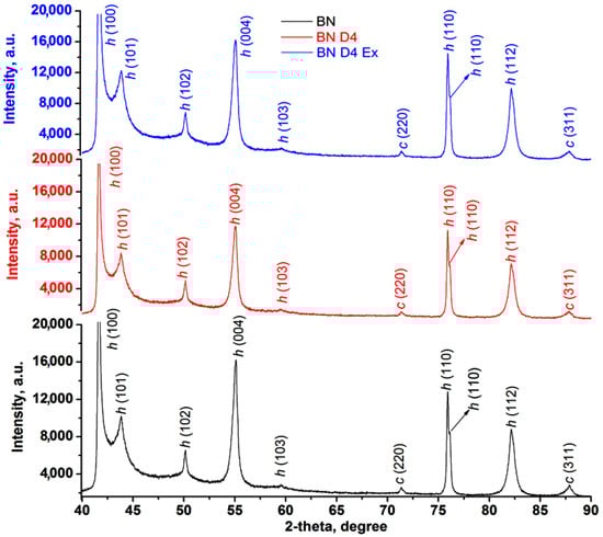 The presence of D4 after hydrophobization (BND4) and exfoliation (BND4Ex) processes was highlighted by the difference of the spectra (Figure 2a) (subtract spectra function), while the hidden and overlapped peaks of the BN, BND4, and BND4Ex in the 1650–830 cm−1 were found by using the second derivative of the spectra (Figure 2b). The vertical dashed lines highlight the spectral changes after the applied treatments on BN particles. Thus, the IR spectrum of BN shows two absorption bands, at 1337 cm−1 and 762 cm−1, assigned to the B-N stretches (hBN). The subtracted IR spectra (subtract BND4 and subtract BND4Ex), consisting on the difference between the BN spectrum and BND4 or BND4Ex spectra, respectively, revealed the presence of the asymmetric and symmetric stretches of C-H bonds (in Si-CH3 groups) at 2964 and 2922 cm−1, as well as 1258 and 851 cm−1 deformation, and the stretching vibrations of Si-CH3 groups and Si-O-Si stretches at 1092 cm−1, proving the hydrophobization of the BN particles, which stretch at 1337 cm−1, is redshifted by 44–48 cm−1 in the treated and exfoliated samples, due to the distortion of the hBN lattices as a result of applied treatments [26]. After the applied treatments of the BN particles, the presence of the isolated OH groups by the band at 3694 cm−1 of weak intensity can be observed. The second derivative of the spectra in the 1650–830 cm−1 spectral region (Figure 2b) evidenced the presence of the absorption maxima characteristic for the hBN crystals, O-H deformation/twisting/wagging vibrations at 1290 cm−1, 980, and 872 cm−1, overlapped with C-H deformation vibrations from D4. The maxima at 1168 and 1054 cm−1 are characteristic for Si-O stretches, being of higher intensity in BND4 and diminishing in BND4Ex [27]. Beside these, the existence of the cBN traces (phase mixture with hBN) in all samples was confirmed by the band at 1066 cm−1 and also proved by PXRD [28,29]. In the XRD patterns for initial, hydrophobized, and exfoliated BN particles, one can observe the presence of characteristic diffraction peaks for hBN at 2θ: 41.6, 43.8, 50.1, 55.1, 75.96, 76.16, and 82.15, corresponding to planes (100), (101), (102), (004), (110), and (112) (Figure 6). In addition to these majority peaks, other two lower angle peaks at 2θ: 71.35 and 87.88 are associated with the (220) and (311) planes of cubic BN (cBN) [27]. The same peaks are identified in all samples before and after hydrophobization and exfoliation processes, suggesting the homogeneity of the sample and the absence of the additional phase transformations during the applied treatments.