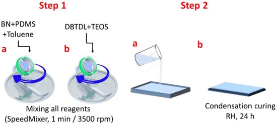 The composite manufacturing process comprises the following steps: Step 1a—the proper amounts of boron nitride and PDMS (Table 1) were mixed using the SpeedMixerTM DAC 150 SP with toluene until a white clear solution was achieved; Step 1b—the catalyst (DBTDL) and the cross-linker(TEOS) were added and mixed all together; Step 2a—the final mixture was drop-casted on a Teflon-coated substrate; Step 2b—after 24 h, the composite films were easily removed from the substrate and kept for 3 weeks, in laboratory conditions, before full characterization (Figure 7).