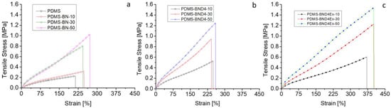 Stress–strain curves for the three composite series: (a)—with the pristine BN powder; (b)—with BN treated with D4; (c)—with BN treated with D4 and exfoliated.