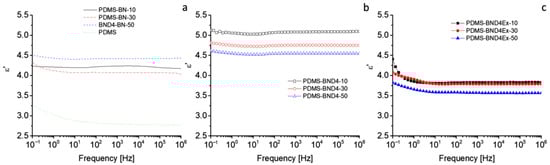 For thermal management, the materials must have dielectric permittivity and dielectric losses as low as possible. The dielectric spectra, recorded at room temperature in the range 1–106 Hz, indicate insignificant variations, with frequency in the PDMS-BN and PDMS-BND4 series (Figure 9). In the PDMS-BND4Ex series, a low-frequency region can be distinguished (from 0.1 Hz to 10 Hz), where ε′ slightly decreases (e.g., from 4.4 to 3.8 in the case of PDMS-BND4Ex-10), and after that, it remains mostly constant.