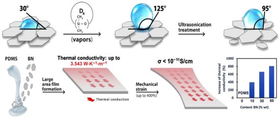 With the three types of BN (pristine BN, BND4, and BND4ex), three corresponding series of composites were prepared, by their incorporation in PDMS matrix, in percentages of 10, 30, and 50 wt% (Table 1).