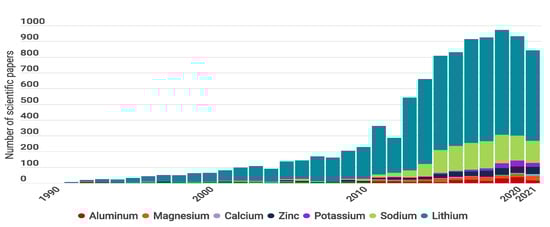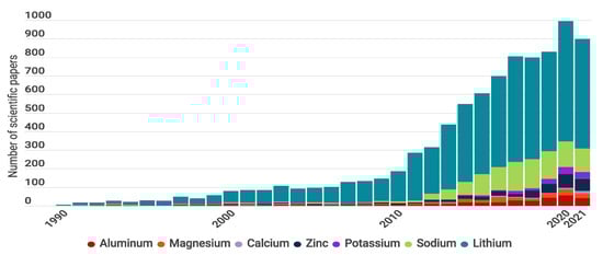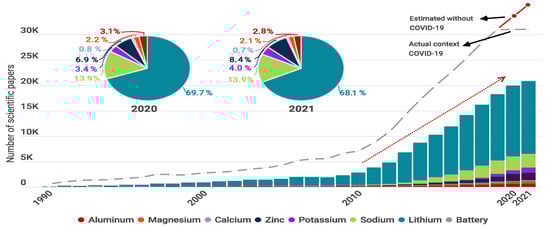 To demonstrate the evolution of batteries, Figure 1 presents a bibliometric review of published articles from 1990 to 2021 and compares seven battery types according to the working ions Li, Na, K, Zn, Ca, Mg, and Al. In Figure 1, the difference between estimations and the actual number of publications demonstrates the drop off in research in 2020 and 2021, which could be the result of the pandemic [].