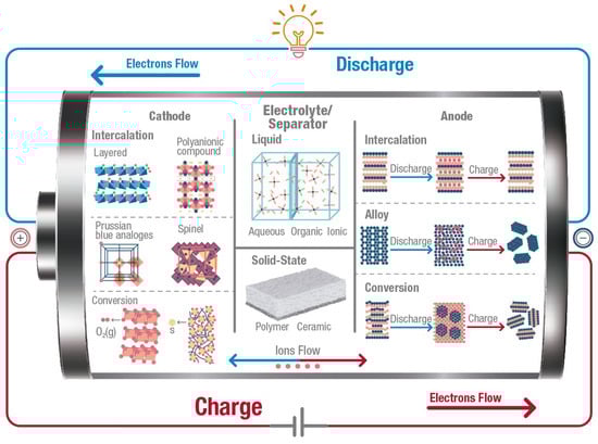 A battery is an electrochemical energy storage system that converts chemical energy into electrical energy. A battery consists of several electrochemical cells which integrate four main components as shown in Figure 2: (1) the anode or negative electrode; (2) the cathode or positive electrode; (3) the electrolyte that is the medium between the anode and cathode; and (4) the separator, a membrane to physically separate the anode and the cathode electrically. During discharge, ions move from the anode to the cathode through the electrolyte, and electrons flow from the anode to cathode through an external circuit. During charge, ions come back to the anode through the electrolyte while an external source forces the electrons to move from the cathode to the anode side. Although Li is the most used, other working ions include Na, K, Zn, Ca, Mg, and Al. It is crucial to keep in mind that the chemistry inside a battery changes according to the working ion used. Therefore, the anodes and cathodes used for Li-based batteries cannot be frequently used in the other battery types.
