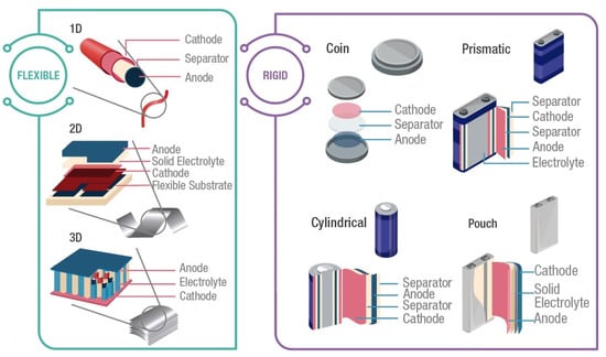 Batteries can also be rigid or flexible according to the fabrication processes, material mechanical properties, and internal configuration. Rigid batteries have hard packing, and they are manufactured based on the slurry-casting method and also by dry electrode technology []. In contrast, flexible batteries (FB) are based on multilayers of a separator sandwiched by two electrodes, with a versatile packing []. The advantages and disadvantages of rigid and flexible batteries are described in the following paragraphs.