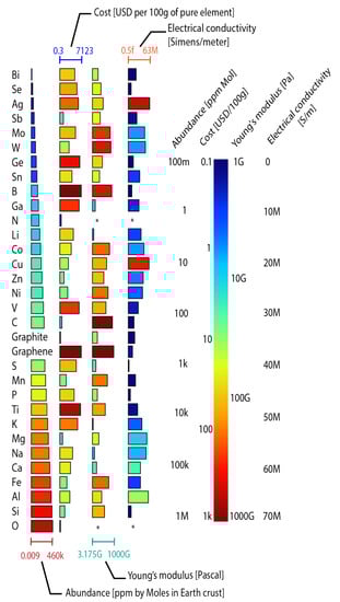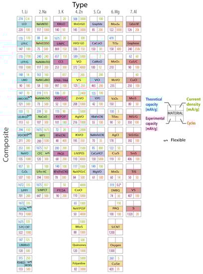 Figure 4 illustrates the abundance of the Earth’s crust, costs, Young’s modulus, and the electrical conductivity of raw materials used in commercial and prototype batteries. Na, K, Zn, Ca, Mg, and Al are promising materials for batteries since they are more abundant than Li. In addition, the costs of these abundant materials are lower than the costs of Li. Although in most batteries, the materials are used in the form of compounds instead of elements as presented in the Figure, identifying all compounds is challenging. Therefore, the elements that are used to create the compounds were selected. These results suggest that battery costs can be reduced using abundant and cheaper materials for manufacturing. Young’s modulus is a mechanical property that refers to the ratio of stress to a strain of a material. Figure of merit (fFoM) of materials flexibility exposes that a small Young’s modulus provides a high flexibility, being a critical parameter in guiding an appropriate selection of materials for the design of flexible batteries [,]. Finally, high electrical and ionic conductivity are crucial to promote electron transference, determining the rate performance in batteries [].