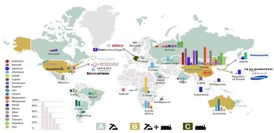 The manufacturing process is another critical point that affects battery cost. Commercial batteries integrate raw materials that are distributed around the world, as shown in Figure 5, while the countries that fabricate batteries are not the ones that produce raw materials. For instance, the raw materials for LIBs, such as lithium and cobalt, are distributed in South America and Africa, while the significant battery manufacturing companies are in China, Germany, Japan, the Republic of Korea, and the USA. As a result, battery companies must import raw materials to manufacture batteries. Another challenge in manufacturing is to achieve sustainable production through a reliable provision of raw materials and appropriate management of materials at the end of battery life. Some proposed solutions include reusing waste battery materials, resource conservation, useful creation, and reliable mining policies [].