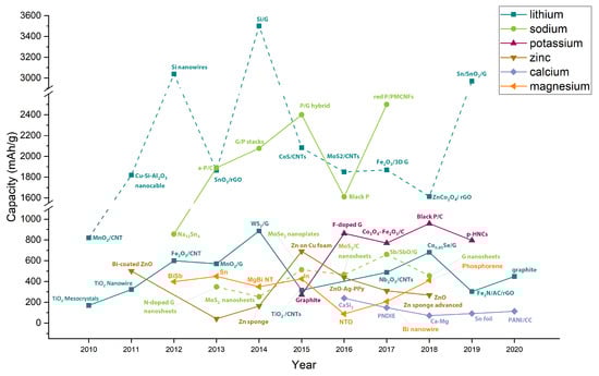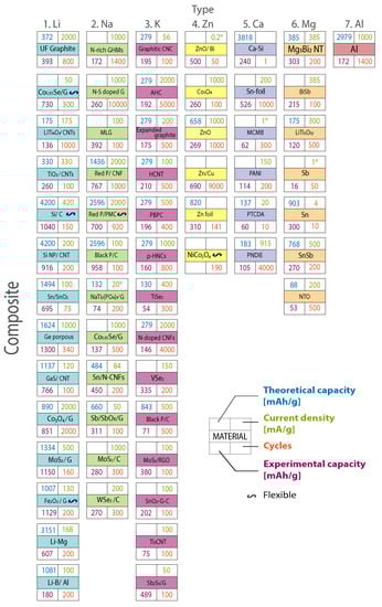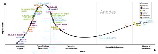 The anode is the negative electrode of a battery that oxidizes (loss of electrons) during the discharge process [], and it plays different roles according to the work ion, critical for the operation of rechargeable and non-rechargeable batteries. An ideal anode for rechargeable batteries should have a high capacity, low potential against cathode material, low volume expansion, long cycle life, low cost, and environmental compatibility []. Metals, such as Li, Na, K, Mg, Ca, Zn, and Al, have been explored as potential anodes due to their high energy density and low potential.