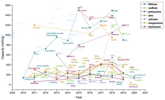 In contrast, the published articles for K, Ca, Mg, and Al represent only % of the total publications. This could be the result of drawbacks that have not yet been resolved and that limit the development of practical batteries. However, there seems to be a growing interest in these new technologies considering that the percentage of publications has increased from 2020 to 2021. Some examples of these technologies are K-ion (KIB) [], K-S ( 1023 kg−1) [], Ca-ion (CIB), Mg-ion (MIB), Mg-S, Mg-air [], Al-ion (AIB) and Al-air batteries.