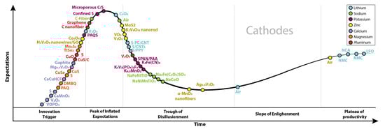 A monovalent battery is a mature technology in which each ion generates one electron in the external circuit. On the other hand, in a multivalent battery, one ion generates two or three electrons in the external circuit, depending on the charge carrier ions. Consequently, in multivalent batteries, a higher current density is generated, and also the capacity could be doubled or tripled [,]. Common monovalent ions are Li, Na, and K, and the most researched multivalent ions are Zn, Ca, Mg, and Al.