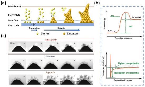 (a) Schematic illustration of the formation and growth of Zn dendrites. (b) The energy barrier involved in Zn nucleation and the typical voltage profile during Zn deposition. (Reproduced from [69] with permission from Wiley.) (c) The growth, dissolution, and regrowth process of Zn dendrites during battery cycling. (Reproduced from [80] with permission from Elsevier).